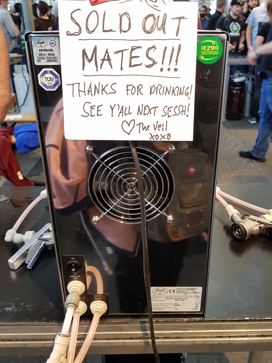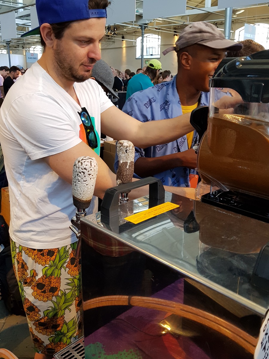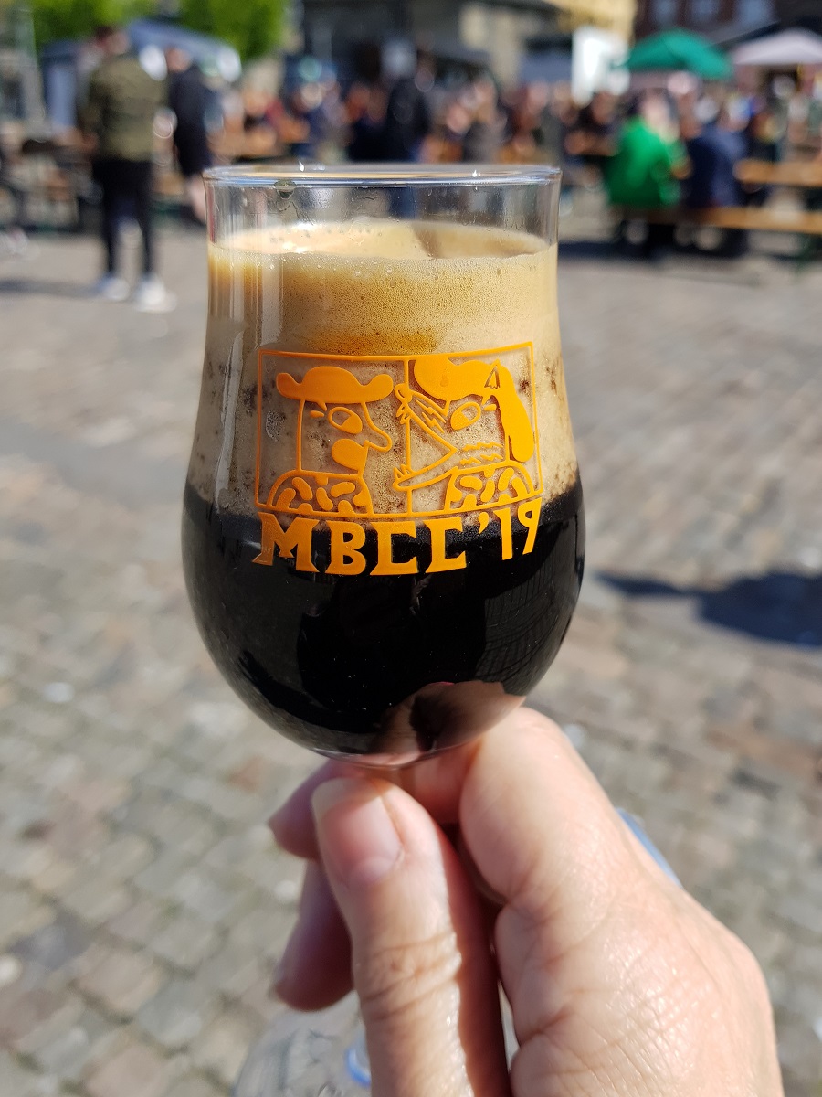 Wir starten in einen wunderschönen zweiten Tag! Auch heute gehören wir wieder zu den Ersten und sind rasch in der Halle. Wir haben uns gut vorbereitet und stehen als erstes bei ‚3 Sons‘ an, wo wieder eine sehr lange Schlange ist. Während Rolf ansteht, ’schwärme‘ ich aus, um uns ein erstes Bier zum Probieren zu holen. Und die Zeit reicht sogar aus, die Gläser auszuspülen. Nach gut 15 Minuten haben wir unser Bier in der Hand: 3 Sons / BA Scoop – ein wunderbares Imperial Stout, mit beigem, dichtem Schaum. Herrlich der Geschmack nach Toffee, Caramel, Bourbon, Nüssen und dunklem Malz.