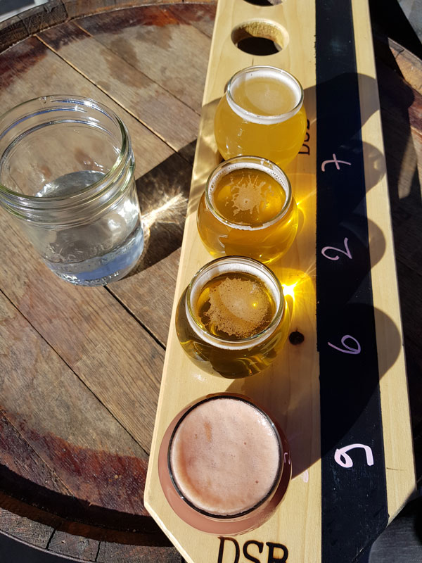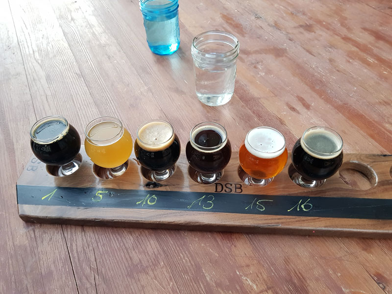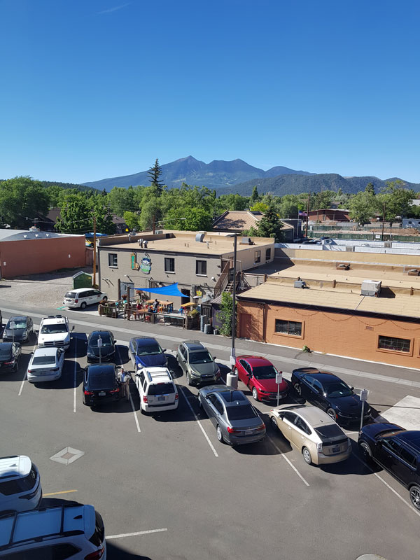 Wir kommen nach gut 600 km in Flagstaff an und haben die Stunde Zeit, die wir beim letzten Zeitzonenwechsel verloren haben, wieder zurück. Glück gehabt! So haben wir mehr Zeit für eine ausgiebige Verkostung. Rasch das Hotelzimmer mit direktem Blick auf die Brauerei beziehen und ab für ein erstes Flight bei Dark Sky Brewing Co. Wir geniessen die Sonne und freuen uns auf die Biere.