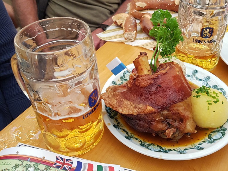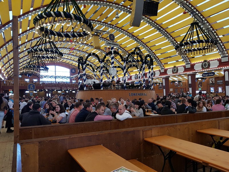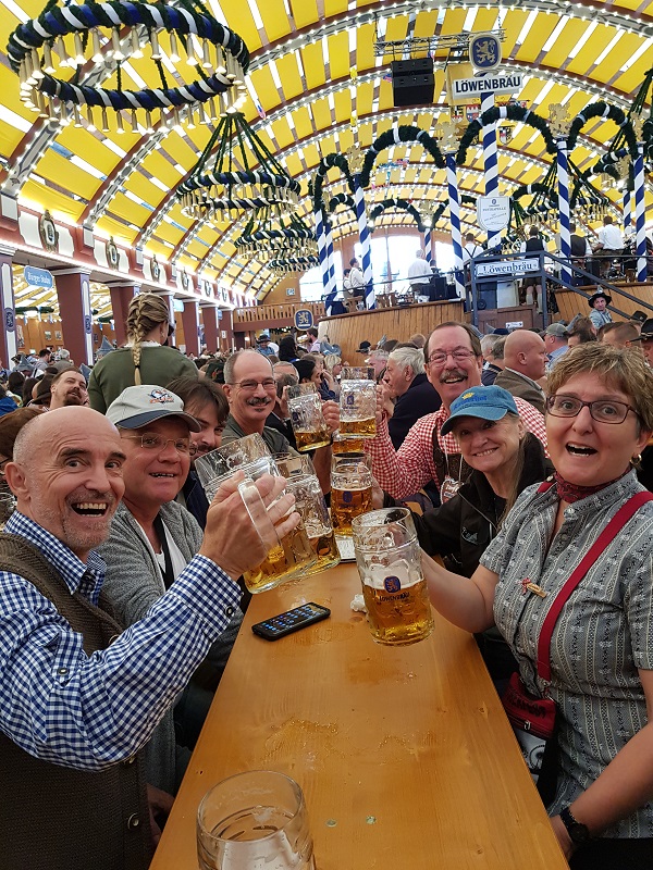 Am Montag sind wir nach einem ausgiebigen und leckeren Frühstück im Löwenbräu Festzelt (innen 5700 / aussen 2800 Plätze). Wir müssen heute ins Zelt, da es regnet und es draussen garstig ist. Eigentlich sind wir nicht die Zeltgänger, hier treffen wir jedoch Richard, unser AirBnB-Host aus San Diego mit drei seiner Freunden. Als die Musik um 12.00 Uhr startet, geht die Post so richtig ab! Wir heben die Krüge, prosten einander auf die Gemütlichkeit zu und schunkeln im Takt der Musik mit. Eine Kommunikation ist jedoch nicht möglich, da der Lärmpegel sehr hoch ist.