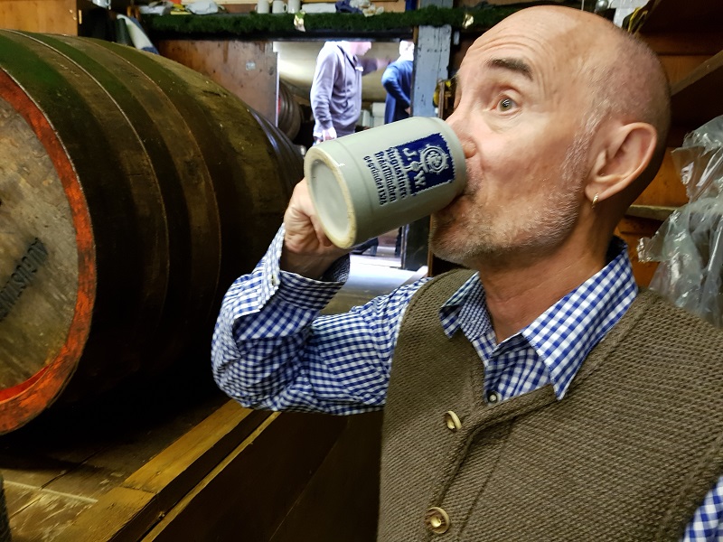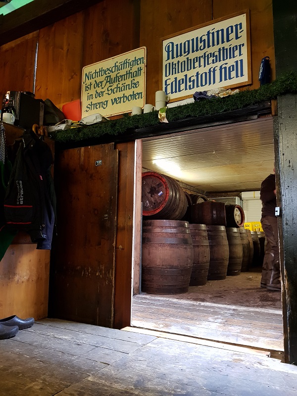 Das Augustiner-Bier gibt es aus dem ‚Hirschen‘, so wird das Holzfass genannt, von welchem das Bier ausgeschenkt wird. Das Fassungsvermögen ist 200 lt, es ist gefüllt gut 300 kg schwer, leer 80 kg und das Bier schmeckt – da aus dem Holzfass – milder und süffiger, da es weniger Kohlensäure hat. Augustiner ist die einzige Brauerei, welches am Oktoberbier ihr Bier (6.4 % Alkohol/13.7 % Stammwürze) aus echten Holzfässern ausschenkt. Diese werden in einem speziellen Kühlraum (2 Grad) gelagert, bevor sie zum Einsatz kommen. Thomas erklärt uns, auf was bei der Qualität geschaut wird: