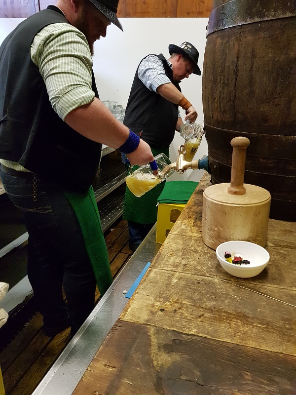 Das Wechseln der Fässer ist ein echter Kraftakt!!! Und ganz ungefährlich ist es auch nicht. Zudem muss das neue Fass so positioniert werden, dass der Zapfhahn im richtigen Winkel reingeschlagen werden kann. Mittels dem ‚Pfeifferl‘, welches oben ins Fass geschlagen wird, erfolgt der Druckausgleiche, damit der Gerstensaft in einer angemessenen Geschwindigkeit ins Gas gelangt. Die leeren Fässer werden nach Mitternacht in die Brauerei gebracht, wo sie gereinigt, kontrolliert und wieder befüllt werden, damit sie um 7 Uhr in der Früh in Kühlraum sind. Wir kommen in den Genuss eines absolut frischen Augustiner Festbieres!!!