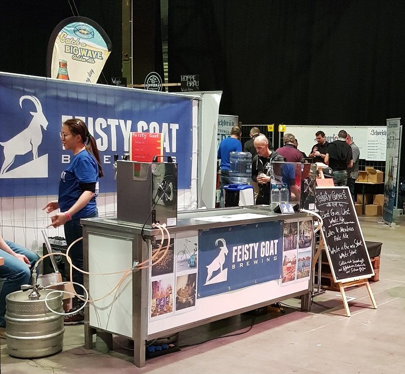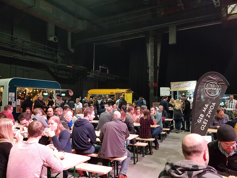 Die CraftBeerMesse Mainz ist übersichtlich und es hat dank breiten Durchgängen genügend Platz. Erst später am Abend, als wirklich viele Leute in der Halle 45 sind, wird es etwas enger. In der Halle hat es verschiedene Gläser-Spülstationen und diverse Sitzgelegenheiten. Zusätzlich offeriert ‚Staatlich Fachinger‘ an ihrem Stand noch kostenlos Mineralwasser! So bleibt der Wasserausgleich immer gewährleistet. Auch für das leibliche Wohl ist gesorgt. In der Foodecke kann man sich an verschiedenen Köstlichkeiten gütlich tun. Und auch dort hat es genügend Sitzplätze (lange Festbänke).