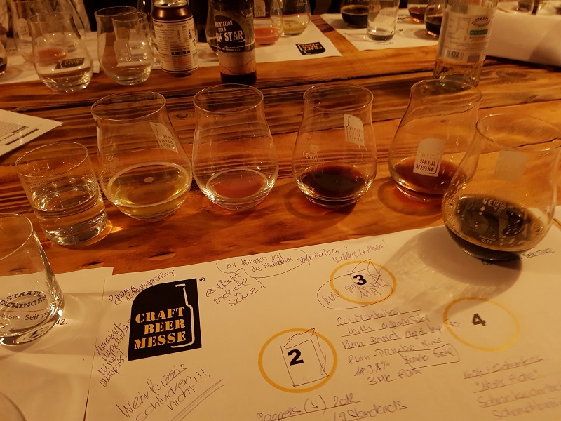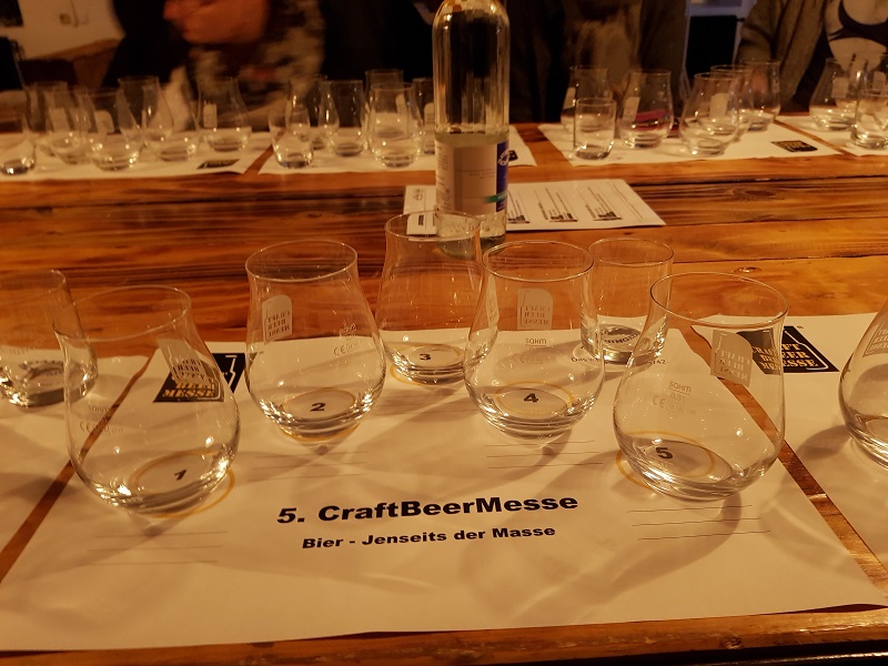 Um 20.30 startet unser Live-Tasting ‚Bier – Jenseits der Masse‘ (€ 15). In der Bar 45 sind an einem langen Tisch mit Hochstühlen Verkostungsgläser mit Notizbogen aufgedeckt. Hier ist es etwas eng, aber da nicht alle Plätze verkauft wurden, können wir uns breit machen. Ein Grund dafür könnte sein, dass diese Tastings das 1. Mal durchgeführt werden und bei den Besuchern noch nicht so bekannt ist. Wir haben im Eingangsbereich auch nirgends einen Hinweis/Werbung dafür gesehen, was eigentlich schade ist. Die Messebesucher wurden zwar auf die Tastings angesprochen, ich weiss aber nicht, wie viele sich so spontan dafür entschliessen konnten.