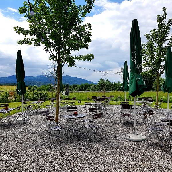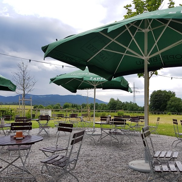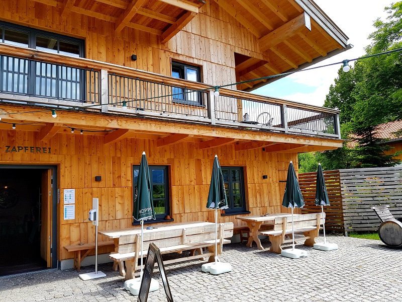 Weiter geht’s. Die Fahrt vom Schliersee nach Waakirchen ist kurz (24 km). So sind wir bald bei Hoppebräu bzw in der Zapferei. Begonnen hat alles 2010 in einer Garage. Markus Hoppe hat sein erstes ‘Garagenbräu’ gebraut um dann später als Kuckucksbrauer (neben seinem Job als Braumeister) in ‚fremden‘ Brauereien seine eigenen Biere zu brauen. Bald folgte der Schritt in die Selbstständigkeit und im November 2018 wurde dann der Traum der eigenen Brauerei wahr. Ein neues Bierparadies ist entstanden, inklusive gemütlichem Gastraum (55 Plätze, Blick auf die Brauanlage) und einem wunderschönen Biergarten (60 Plätze) mit Aussicht auf die grünen Wiesen und Berge. Aufgrund ‚Corona‘ ist die Gaststube als auch der Biergarten zZ grosszügig gestuhlt.