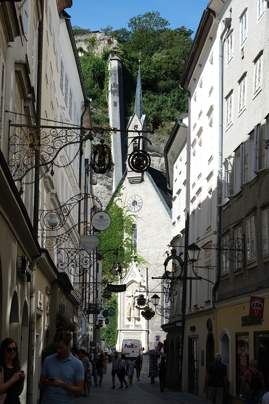 Am nächsten Tag geht es weiter nach Salzburg. Am linken Ufer der Salzach liegt die als Fußgängerzone ausgewiesene Altstadt mit Gebäuden aus dem Mittelalter und Barock. Auf der gegenüberliegenden Seite des Flusses erstreckt sich die Neustadt aus dem 19. Jahrhundert und die Schlösser, Parks, Museen und natürlich Mozart ziehen jährlich endlos viele Touristen an. Auch jetzt während Corona ist in der Altstadt reges Treiben. Wir machen einen kleinen Abstecher auf den Kapuzinerberg, von welchem man eine tolle Aussicht auf die Salzach und die Altstadt hat. Und nicht viele Touristen nehmen den anstrengenden Aufstieg unter die Füsse. Selbstverständlich schlendern wir auch durch die Altstadt, um die vielen Sehenswürdigkeiten zu bewundern.