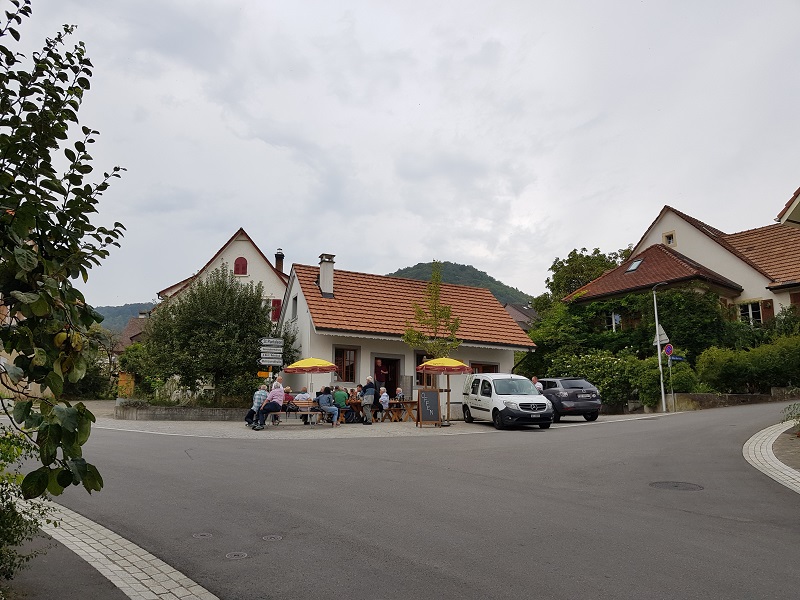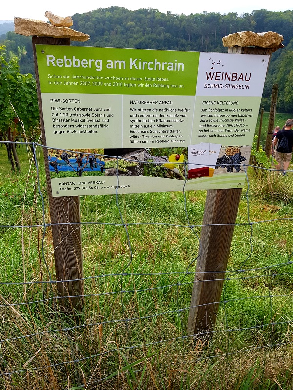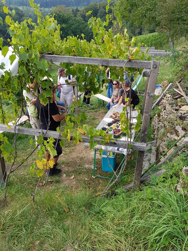 Nach gut einer Stunde haben wir unser erstes Ziel erreicht: der Rebberg von Christine Stingelin und Hans Peter Schmid, Weinbäuerin und Weinbauer aus Leidenschaft. 2007 haben die beiden den Rebberg in Nuglar angelegt und sie setzten auf die pilzwiderstandsfähigen Sorten Cabernet Jura, Solaris und Birstaler Muskat. Ihr Credo lautet: Naturnaher Anbau und Schutz der natürlichen Vielfalt im Rebberg. Seit 2010 keltern sie im ehemaligen Dorfladen von Nuglar ihre Weine und verkaufen sie auch dort. Die beiden haben für unsere Gruppe einen schönen Apéro vorbereitet, welchen wir im steilen Rebberg einnehmen dürfen. Alle Zünftler(innen), die nicht wandern wollten, stossen nun auch zu uns. Während wir den NUGEROLO Solaris und Cabernet Jura verkosten, erhalten wir von den Weinbergbesitzern viele Informationen über den Rebberg, die Rebsorten und die Herstellung von Wein. Mir wird klar, dass in jedem Glas NUGEROLE viel harte Arbeit und Herzblut steckt.