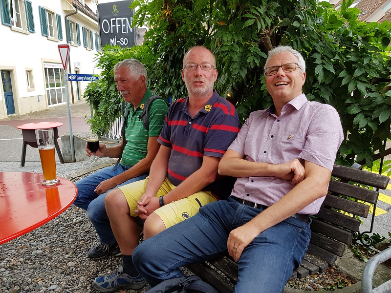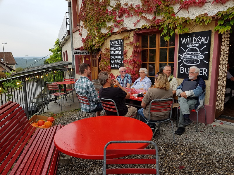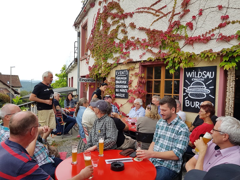 Hier gibt es also BierKüche: vom Apéro bis hin zum Dessert wird mit Bier gekocht, gebraten und geräuchert. Leider müssen wir im Verlauf des Essens in den Gastraum flüchten, da es zu regnen beginnt. Aber für das Abschlussbier können wir wieder auf die Terrasse sitzen.