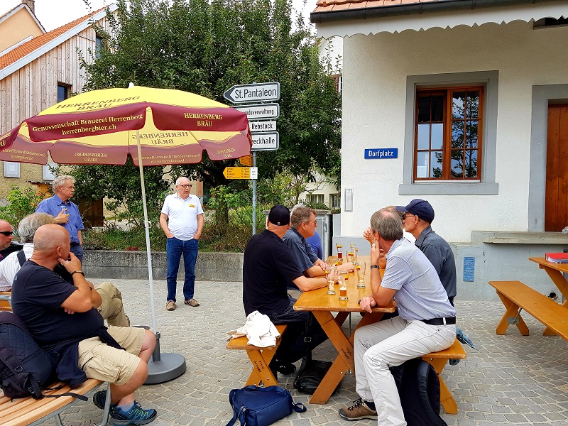 Weiter geht es ins Dorf Nuglar, wo wir uns aufteilen. Meine Gruppe besucht zuerst das Milchhüsli in welchem sich die Brauerei Herrenberg befindet. 2008 haben sich einige Biergeniesser zusammengetan und die Brauerei als Genossenschaft gegründet. Zuerst wurde in einer Garage gebraut, dann konnten sie das Milchhüsli mieten und haben es zur Brauerei umgebaut. Gebraut werden verschiedene Biere wie der ‘Chämifäger’ (dunkel), das ‘Muni Spez’ (helles Lager), das ‘Bintel Alt’ (Amberbier) oder das ‘Chirsi Bier’ (mit Kirschen aus Nuglar). Muni? Bintel? Das sind alles Flurnamen des Dorfes. Wir dürfen einige der Biere verkosten, welche sehr schmackig sind und erhalten dazu Informationen zur Brauerei.