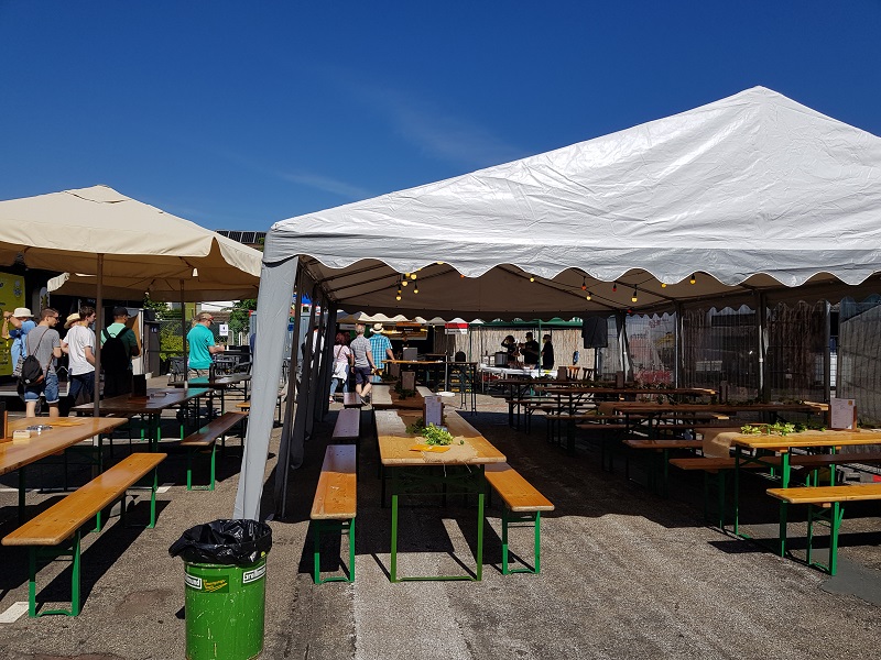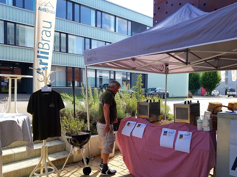 Auch hier haben wir vier Biere zur Auswahl, das Spezli (untergäriges Lager), ein Irish Red, ein Dunkel und das Sommerbier, welches ideal zum Wetter passt. Denn die Sonne scheint immer noch! Selbstverständlich gibt es auch bei Arlibrau wieder etwas zu essen, nämlich Kartoffelsalat mit Merguez (scharf gewürzte Bratwurst). Und selbstverständlich kann auch hier ein Blick in die Brauerei geworfen werden.