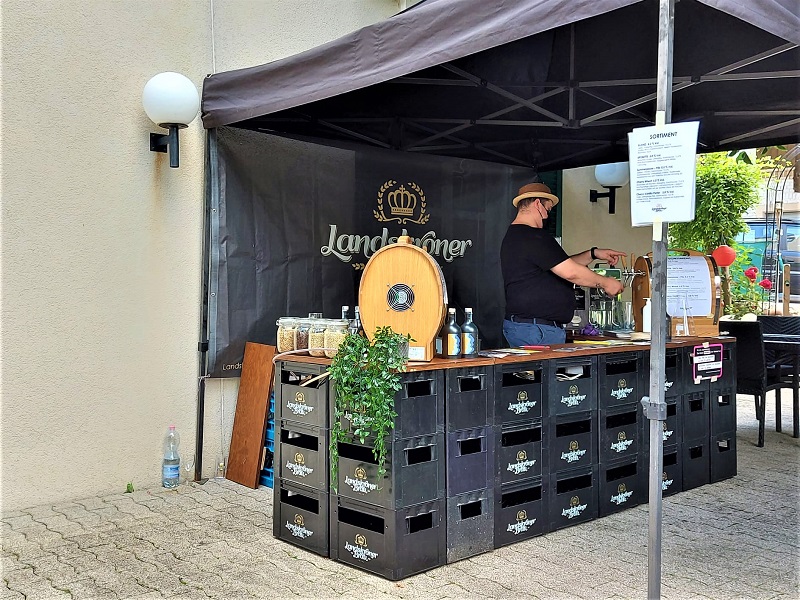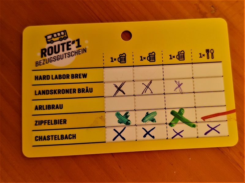 Bevor wir einsteigen dürfen, müssen wir uns noch mittels QR-Codes einchecken (gehört zum Schutzkonzept). Und dann geht es los. Nach einer kurzen Fahrt (knapp 1 km) erreichen wir unsere erste Brauerei: Zipfelbräu. Dort erhalten wir auch das Trinkgefäss, einen Getränke/Essens-Bezugsschein und Informationen zu den Brauereien und den ausgeschenkten Bieren.