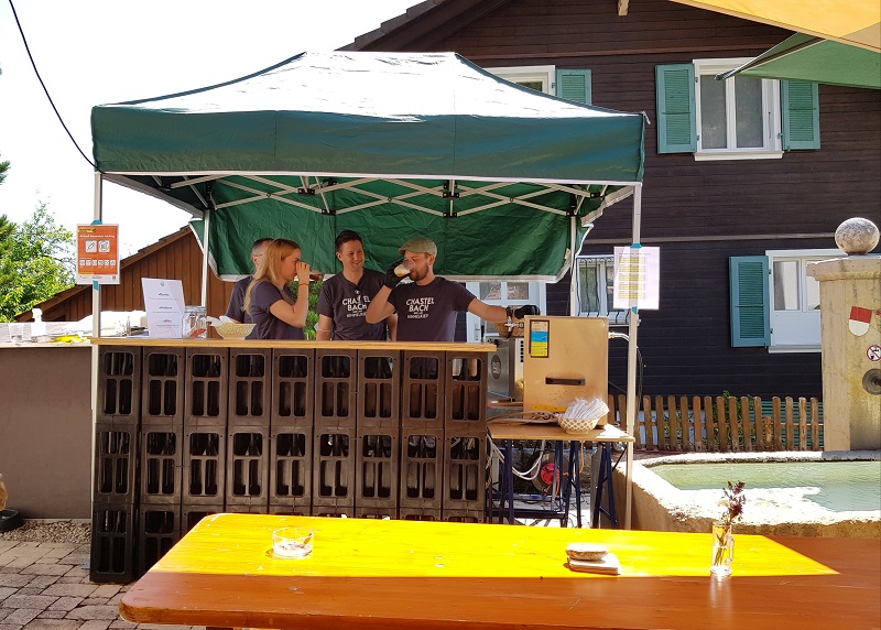 Auch bei Landskroner Bräu vergeht die Zeit wie im Flug. Und schon geht es weiter nach Himmelried, einem Ort, der dem Himmel wirklich nah ist. (662 müM). Im ehemaligen Milchhüsli (kommt uns das bekannt vor?) kann man in wunderschöner Umgebung und weit weg vom Lärm und Verkehr ein Bier geniessen. In der höchstgelegenen Brauerei der Nordwestschweiz hat man einen herrlichen Blick aufs Tal und seit 2005 wird hier Bier gebraut. Die Braustube bzw der Biergarten haben in der Regel freitags von 17.00 bis 22.00 Uhr geöffnet (zZ Einschränkungen wegen Covid19). http://www.chastelbach.ch