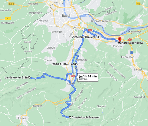 Unsere Route: Zipfelbier in Muttenz – Landskroner Bräu in Hofstetten – Chastelbach Brauerei in Himmelried – ArliBrau in Arlesheim – Hard Labor Brew in Pratteln