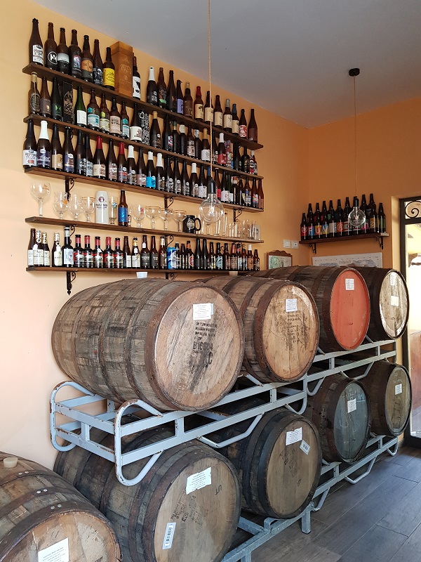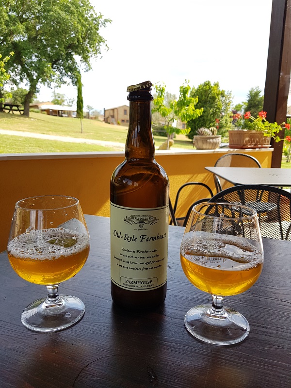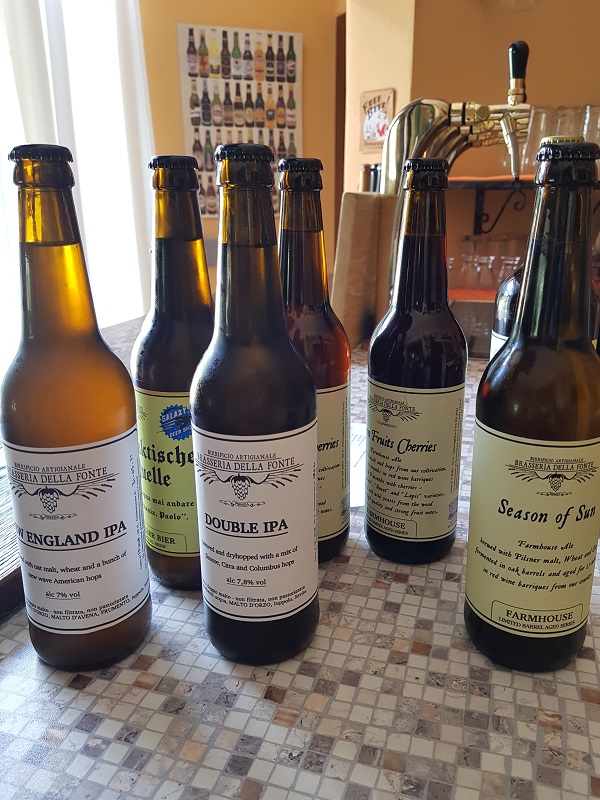 Die Brasseria della Fonte hat in der Regel von 14.30 bis 17.30 bzw 18.30 geöffnet. Man sollte sich jedoch vorher über die effektiven Öffnungszeiten informieren, damit man nicht vor geschlossenen Türen steht. Da wir Blickkontakt von unserem Appartement zur Brauerei haben, sehen wir immer, wann der Taproom öffnet. So machen wir uns gegen 16 Uhr auf den Weg. Wir werden von einer jungen Frau (Laura) freundlich begrüsst und sie erklärt uns, welche Biere zur Zeit on tap bzw in Flaschen (5/7.5 dl) erhältlich sind. Es sind 10 an der Zahl und wir entscheiden uns für das ‘Old-Style Farmhouse Ale’. Das Ale, welches ein Jahr im Eichenfass gereift ist, ist in der 7.5 dl-Flasche erhältlich. Ein guter Einstieg für uns in den Vorabend. Es schmeckt wunderbar und wir geniessen die Ruhe auf der schattigen Terrasse.