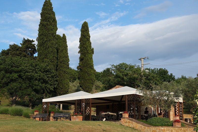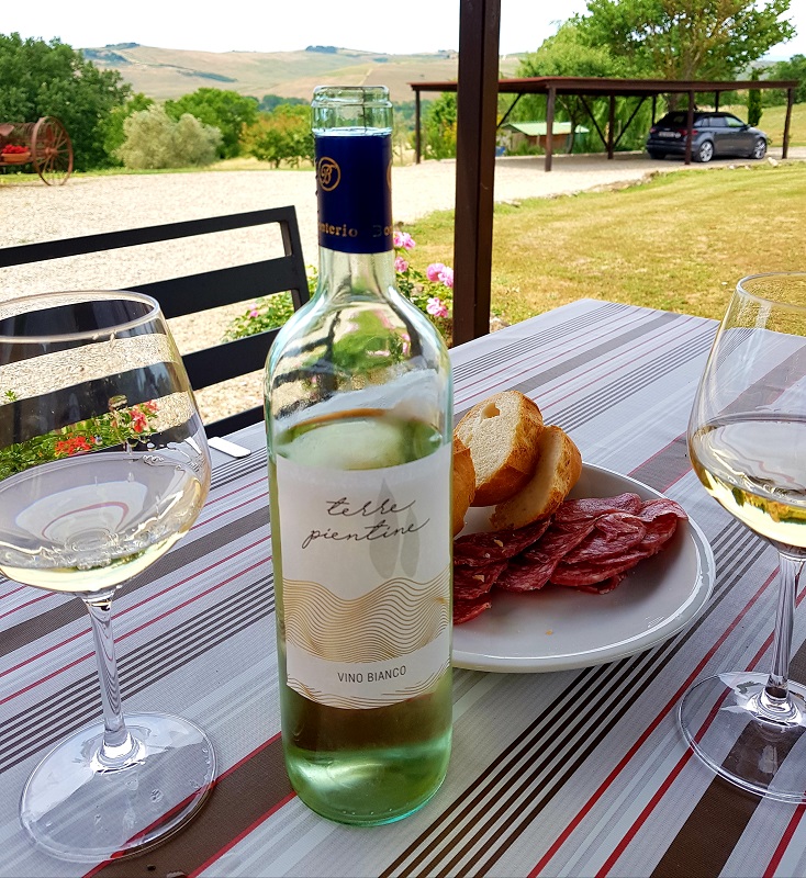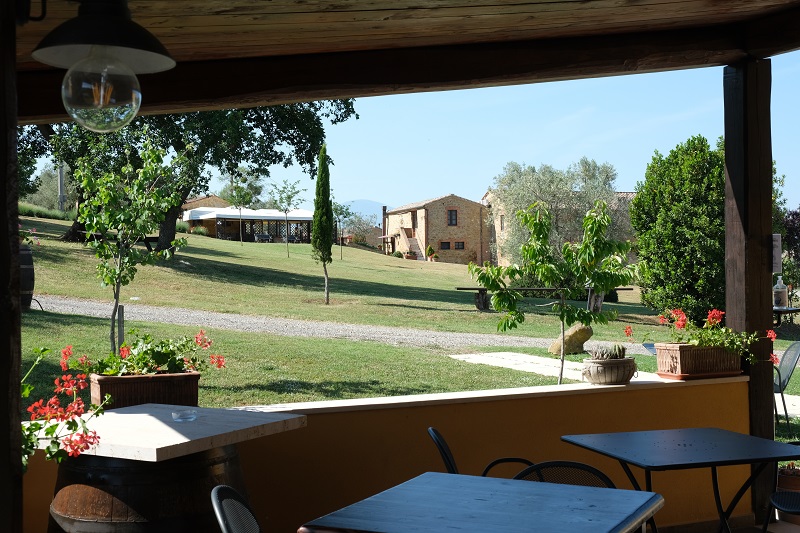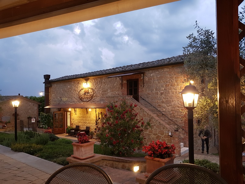 Das La Fonte liegt etwas abseits der Strasse und eine schmale, geschotterte Zufahrt bringt uns in eine andere Welt, in welcher man richtig zur Ruhe kommen kann. Ausser wenn der Hahn kräht (eines der Nutztiere) und dies tut er ziemlich oft und zu ziemlich später bzw früher Stunde. Oder wenn die Hauskrähe unser Auto mit dem Schnabel traktiert, weil sie im Spiegelbild einen Rivalen vermutet. Als wir ankommen ist doch jemand vor Ort und wir werden freundlich von der Gastgeberin begrüsst. Sie teilt uns auch mit, dass das Restaurant geöffnet sei, was uns sehr gelegen kommt, müssen wir doch nicht extra wegfahren. Und das Ristorante La Source soll genial sein. Die Aussicht von unserem Appartement mit dem Namen Granaio (Scheune) ist fantastisch! Wir richten uns häuslich ein, stellen die bereits gekauften Biere in den grossen Kühlschrank (Kühlkette einhalten) und geniessen einen Caffé am sonnengeschützten Tisch vor unserem Zimmer. Auch die Brauerei haben wir bereits gesehen, ist sie doch nur gut 100 Meter von unserer Schlafstätte entfernt.
