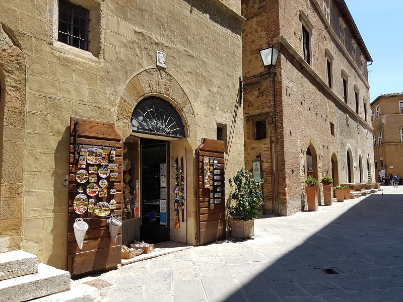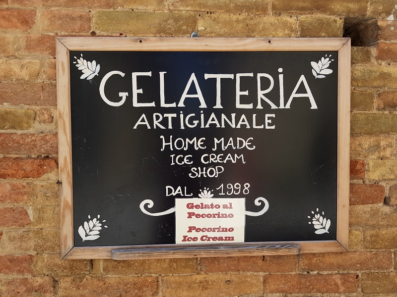 Pienza ist nicht nur eine wunderschöne Ort, deren Altstadt man unbedingt besuchen muss. Es hat viele kleine Läden, Cafés, Osterie und wer gerne Pecorino hat, ist hier im Paradies. Wenn wir nicht noch über eine Woche Reise vor uns hätten, hätte ich mich mit dieser Köstlichkeit eingedeckt. Und: es gibt sogar Eis mit Pecorino.