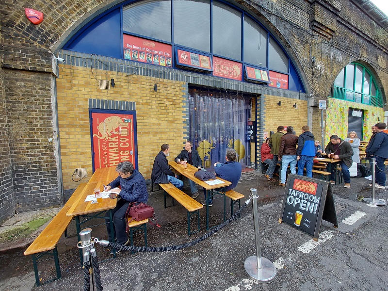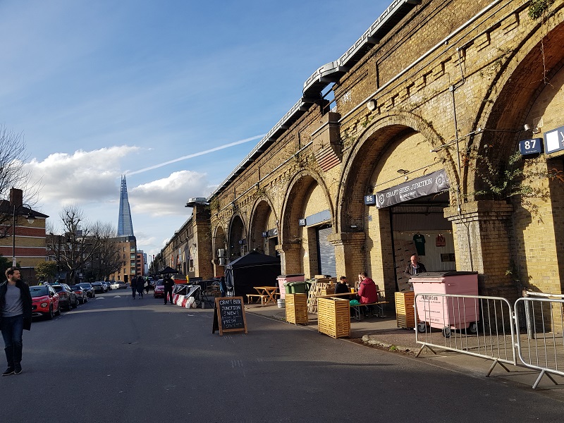 Dann geht es los. Auf der Homepage der Bermondsey Beer Mile findet man eine genaue Wegbeschreibung inklusive Links auf die Homepage der Brauereien. Um 12 Uhr sind schon viele Leute unterwegs, teilweise auch geführte Gruppen, die von Kneipe zu Kneipe wandern. Den richtigen Weg kann man beinahe nicht verfehlen, da alle Pubs in den Eisenbahnbögen sind. Man muss also nur immer die Gleise im Sichtfeld haben und ist richtig. Für den Rückweg kann manb sich ja dann ein Taxi nehmen, wenn man nicht mehr weiss, wo man ist.