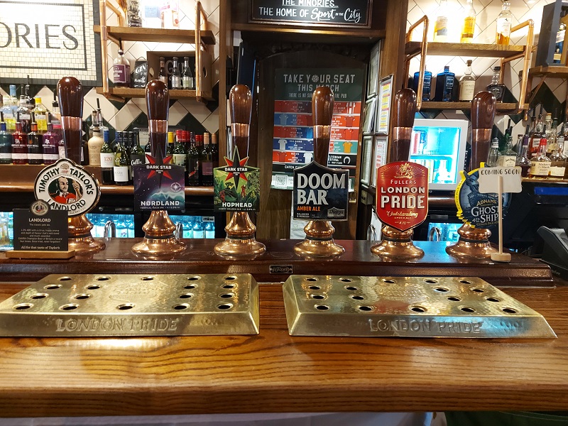 Unser Hotel liegt im Stadtteil City of London, dem historischen Finanzviertel, in dem die Börse und die Bank of England beheimatet ist. Moderne Firmenhochhäuser überragen die Reste mitelalterlichen Gassen. Das Check-in im Hotel geht fix und ab geht es ins 1. Pub. Nur wenige Schritte vom Motel One entfernt finden wir das erste traditionelle Pub: The Minories. Dort finden wir 18 Zapfhähne – 5 davon handgepumpt. Das The Minories ist ein sehr gemütliches, typisch britisches Pub mit vielen TV-Screens, auf welchen ein Sportkanal läuft. Schade ist das Wetter so garstig, denn das Pub hat einen schönen kleinen Garten. Es wird auch ein eigenes Bier gebraut, welche durch eine Pipeline zum Zapfhahn läuft. Ich hole mir an der Bar unsere ersten Biere: