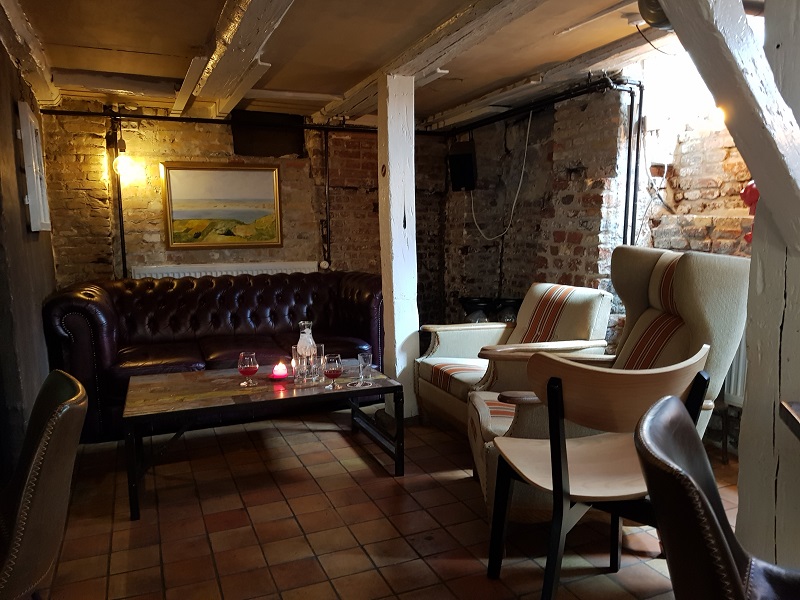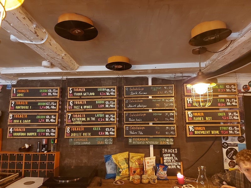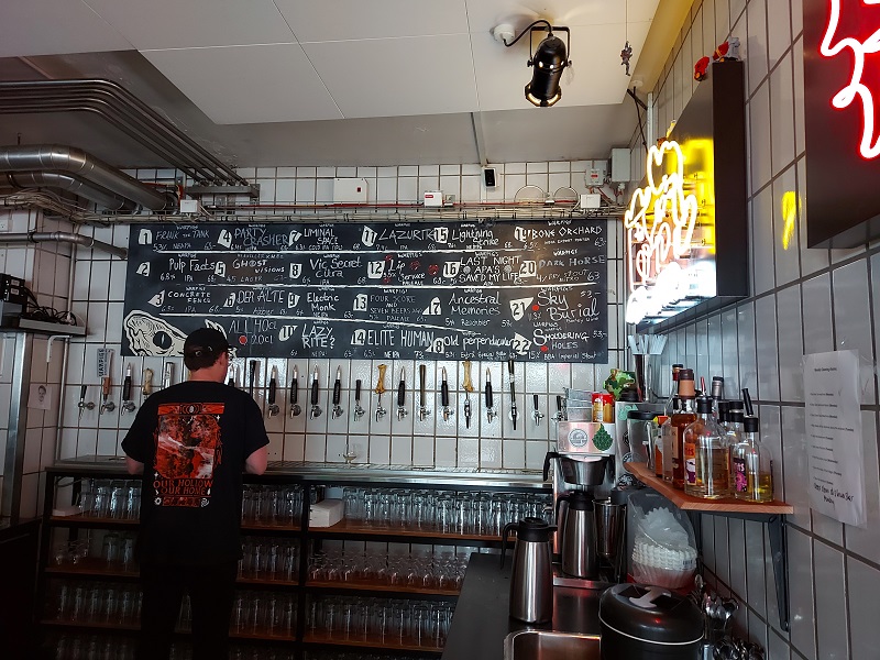 Weiter geht es mit dem Bus zur Pedersen Bar zum Forager TTO. Diese Bar ist das Highlight unserer Reise. Nach dem Trubel und Lärm im Himmeriget ist es hier friedlich, da es nur wenige Gäste hat. Der Eingang zur Bar, welche sich in einem Kellergewölbe befindet, ist unscheinbar. Wir wären beinahe daran vorbei gegangen. Die Einrichtung ist absolut einmalig und es läuft coole Musik! Hier gefällt es uns und hier bleiben wir länger. Zum Bier bekommen wir noch automatisch Wasser und falls einem der kleine Hunger packt, gibt es auch Snacks zu essen.