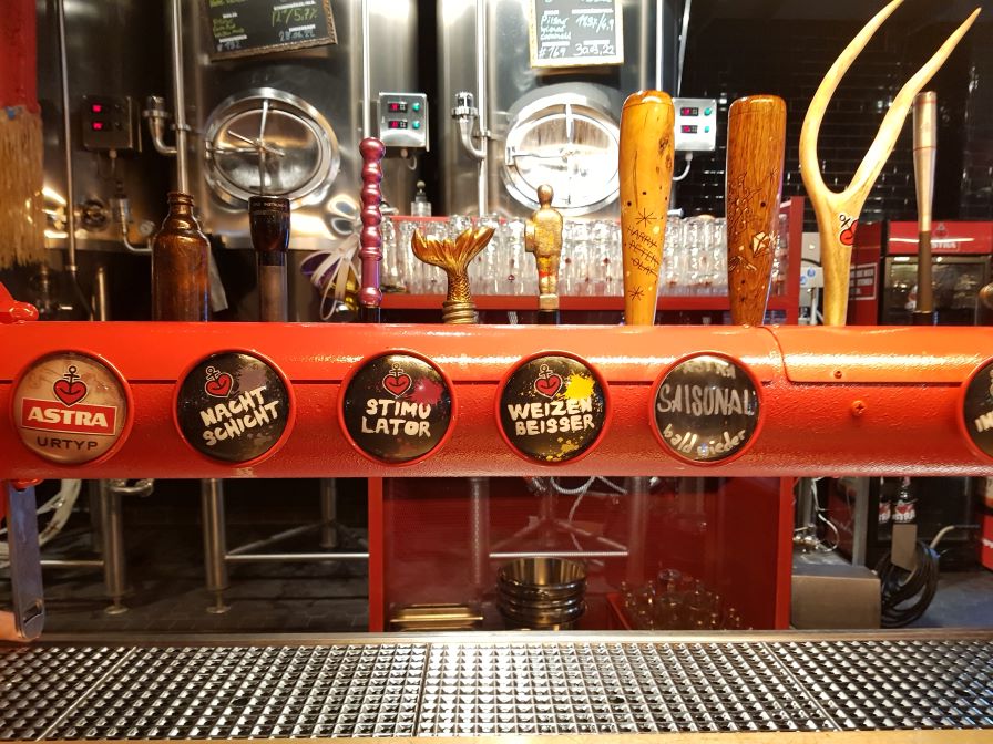 Montagnachmittag, 16 Uhr. Wir stehen vor der Astra St. Pauli Brauerei, welche heute geschlossen hat. Aber Iris öffnet für uns die Pforte zu dieser lässigen Craftbier-Oase, wo während den Öffnungszeiten richtig die Post abgeht. Das Ambiente ist urchig-wild; Backsteinwände, Hochtische aus Holz, Retrosessel und Sofas, eine Discokugel an der Decke und ein langer Bartresen prägen die Einrichtung. Das Ambiente ist lässig und gleichzeitig schräg und ist eine Mischung zwischen Astra-Wohnzimmer und Brauküche. Und das passt wunderbar auf den Kiez.