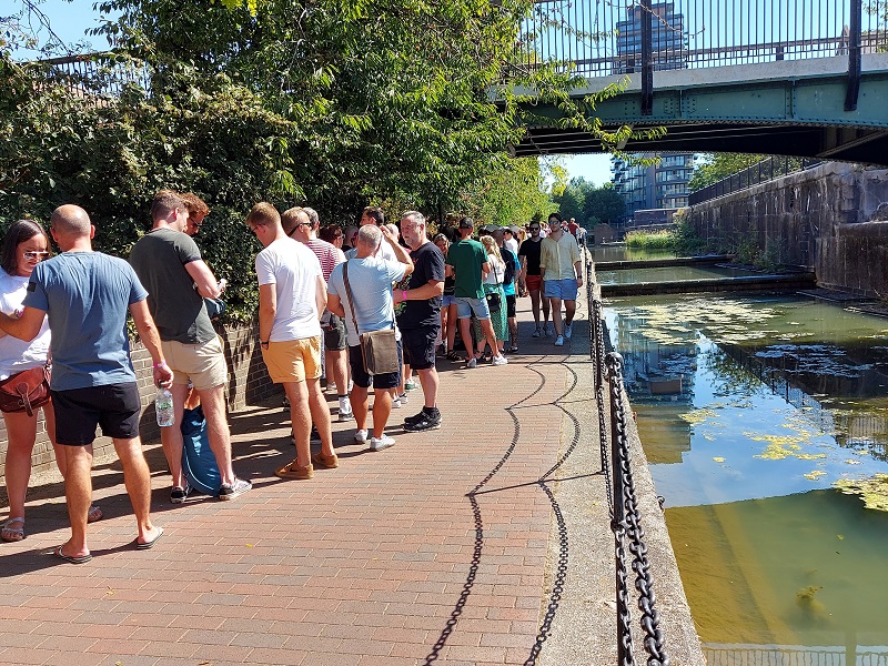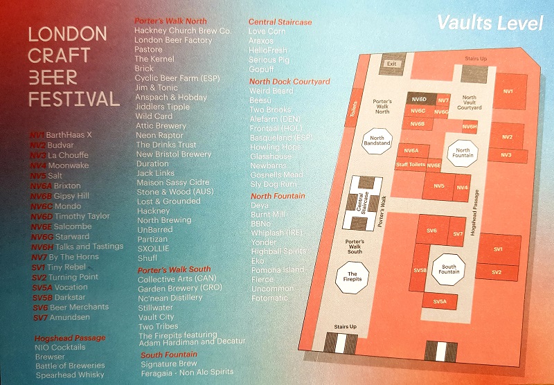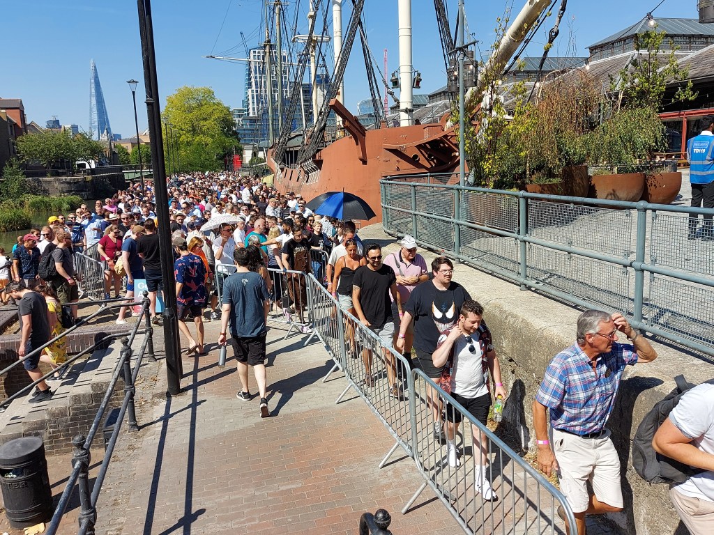 Der Samstag startet gemütlich bei einem ausgiebigen Frühstück. Danach geht es, nachdem wir uns mit genügend Wasser eingedeckt haben, Richtung Tobacco Dock. Die Türöffnung ist um 11.30 Uhr und wir sind um 11.00 Uhr vor Ort. Zuerst stellen wir uns beinahe an der falschen Schlange an, beim Fast Track, welche bereits 150 m lang ist. Schnell finden wir den General Admission und dort verschlägt es uns beinahe den Atem: es stehen gewaltig viele Menschen an!!! Wir sehen unser erstes Bier schon in weite Ferne rücken und stellen uns ganz hinten an. Doch bald sind wir nicht mehr zuhinterst, sondern mittendrinn. Während dem Anstehen werden bereits die Tickets kontrolliert und die Eintrittsbändel abgegeben. Man muss also nur noch für das Glas anstehen. Um 11.30 Uhr beginnt sich dann die Menge zu bewegen. Es geht in einem recht zügigen Tempo vorwärts und dank einer Art Blockabfertigung gibt es beim Beziehen der Gläser keinen Stau. Die Organisation ist perfekt und um 11.40 Uhr haben wir bereits das erste Bier zum Verkosten in den Händen.