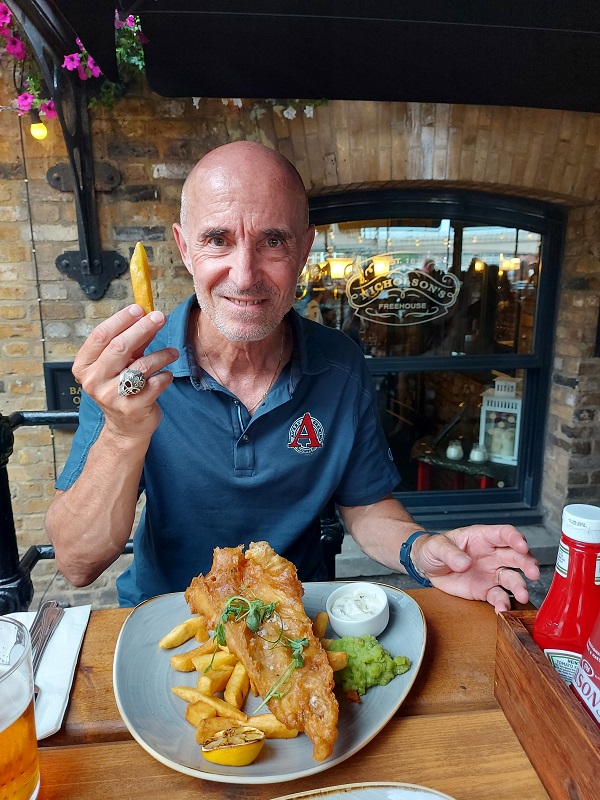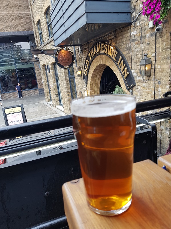 Zum Nachtessen sind wir im Old Thameside Inn. Wir finden sogar noch einen Platz auf der Terrasse und essen geniale Fish & Chips und trinken zwei tolle Real Ale. Bei der Bestellung an der Bar selbstverständlich mit dem Hinweis, dass das Bier warm und ohne Kohlensäure sei. So what?