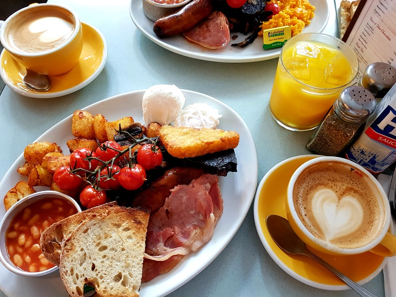 Wir kommen am Freitag aufgrund einer Flugplanänderung bereits um 07.45 Uhr in London Heathrow an. Rasch sind wir bei den Ticketautomaten der Tube, wo wir unsere Oystercards aufladen können. Und dann geht es gut 1 ¼ Std mit der Piccadilly-Line in die Innenstadt. Ich habe fürs Frühstück in einem Café des London Breakfast Clubs reserviert, damit wir uns einen guten Start in das Wochenende gönnen können. Zum Glück haben wir reserviert, denn das Restaurant ist brechend voll. Wir genehmigen uns ein richtig grosses Frühstück – The Full Monty mit allem, was dazu gehört: Bacon, sausage, crispy homestyle potatoes, portobello mushrooms, hash browns, black pudding, beans, roasted cherry vine tomatoes, rich yolk eggs & toas. Dazu einen Cappuccino und Orangensaft. Ein wirklich guter Start in den Tag. Als wir gut 1 ½ Std später das Restaurant verlassen ist die Schlange derjenigen Leute, die auch frühstücken möchten, mindestens 50 Meter lang!