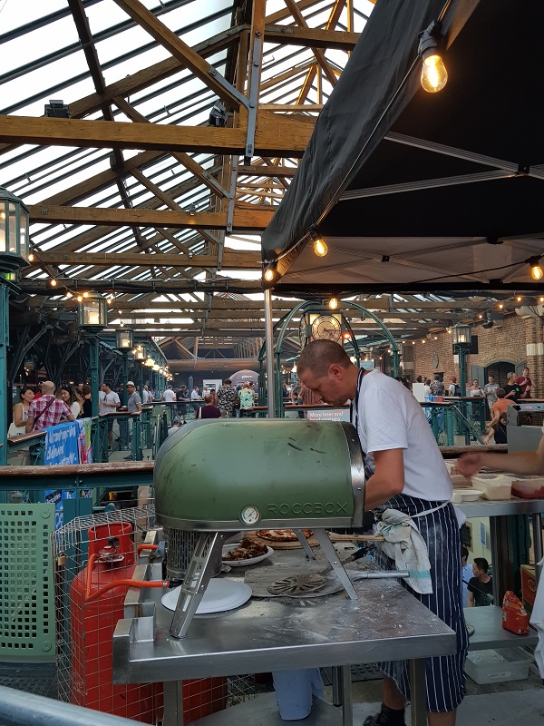 Für das leibliche Wohl ist auch gesorgt. An verschiedenen Verpflegungsständen kann man sich etwas Leckeres kaufen und es drinnen in der Halle oder draussen geniessen. Wir verspeisen draussen unseren süssen, mit Schweinebauch gefüllten Berliner an einem der wenigen Schattenplätze. Kulinarisch ist dieser in Zucker gebadete Pfannkuchen mit der würzigen Fleischfüllen sehr speziell. Irgendwie very british.