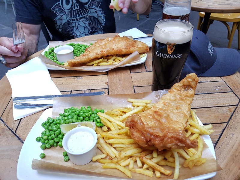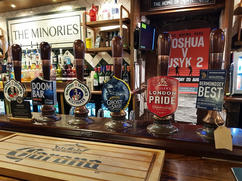 Da wir die ganze Strecke zu Fuss hinter uns gebracht haben, ist der Hunger gross geworden. Darum gehen wir ins The Minories, um ihn zu stillen. Dort werde ich etwas enttäuscht. Nicht von den Fish & Chips, die schmecken wunderbar. Ich will ein Real Ale, aber an den fünf Pumphähnen wir nur ein einziges ausgeschenkt! Schade! Beim Bestellen an der Bar werde ich dann auch noch darauf aufmerksam gemacht, dass das Real Ale warm sei und keine Kohlensäure hätte. Ob ich das WIRKLICH wolle. JA, GENAU DAS WILL ICH!!! Sie hätten sonst noch Birra Peroni oder das Australische Fosters, welches ich in Down Under noch nie an einem Zapfhahn gesehen habe. Und nein, das eigene vor Ort gebraute Bier gibt es auch nicht. Frust pur! So gibt es ein Guinness und ein Timothy Taylor’s Best Bitter. Auch nicht schlecht. Und die Stimmung im kleinen Biergarten bläst den Frust schnell weg.