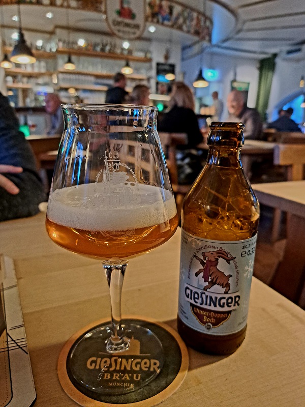 Pünktlich auf die reservierte Zeit werden wir an unseren Tisch geführt. Dort bestellen wir etwas deftiges zu Essen. Schliesslich brauchen wir einen guten Boden. Dazu gibt es den Giesinger Innovator, ein untergäriger Doppelbock mit sattem Malzkörper und fein-würzigem Hopfenaroma und den Giesinger Winterbock. Dieser obergärige Bock überzeugt mit seiner schönen Hopfennote. Beide passen wunderbar zum Essen. Ein perfekter Start!