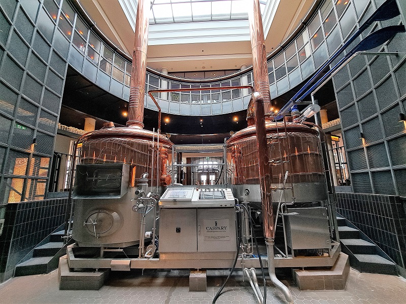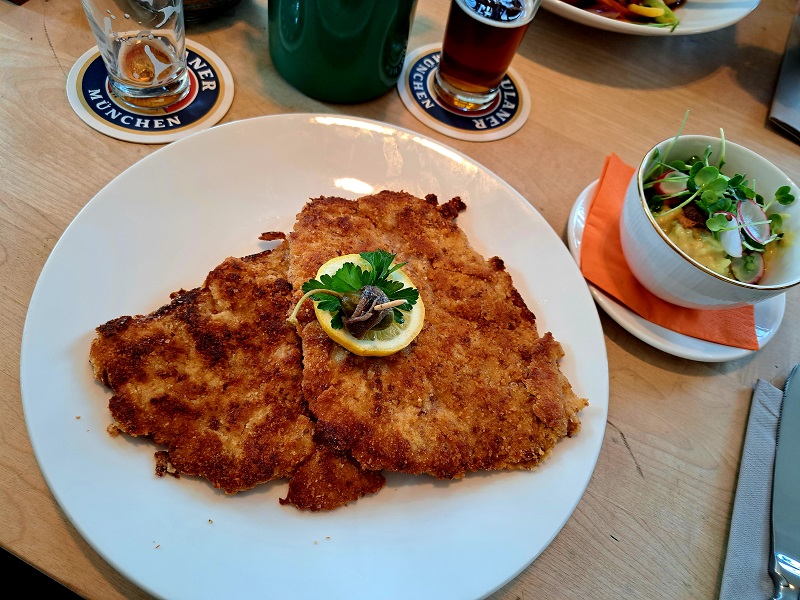 Der Gastraum ist hell und luftig gestaltet und im Zentrum steht die Brauanlage. Das Essen schmeckt ausgezeichnet. Dummerweise lassen wir uns noch auf ein Dessert ein: einen Kaiserschmarrn, welcher nicht nur fantastisch schmeckt sondern mit seinen mindestens 1000 kcal eigentlich eine volle Mahlzeit ist. Aber man gönnt sich ja sonst nichts.
