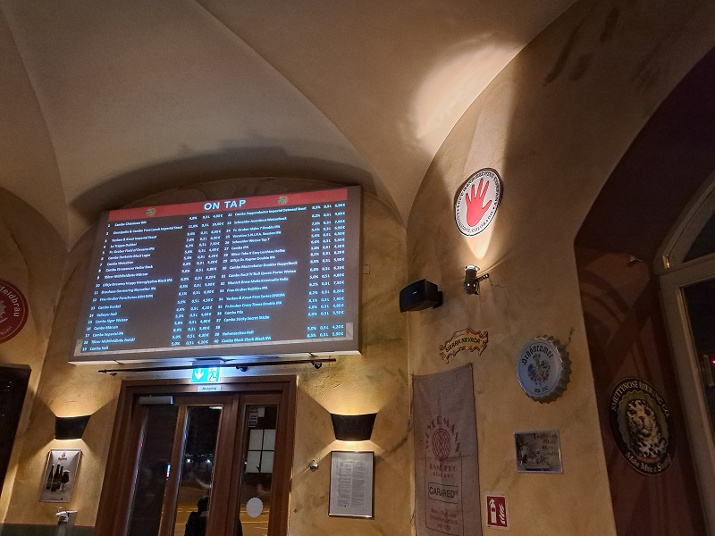 Da der nächste Bus zurück zum Hotel (hält mehr oder weniger direkt vor dem Hoteleingang) erst in 20 Minuten fährt, machen wir noch einen Zwischenstopp bei Frisches Bier. Auch hier hat es sehr viele Leute und wir finden gerade noch knapp zwei Plätze an der Bar.