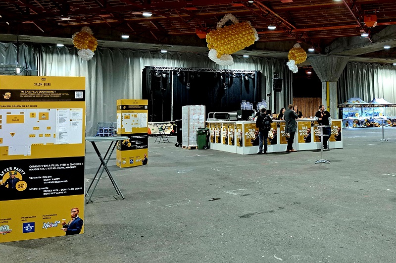 Der Salon de la Bière hat um 11 Uhr gestartet. Wir sind also sehr früh da und es hat so gut wie keine Leute. Schon beim Eingang merken wir, dass der Anlass gut organisiert ist. Überall sieht man Helfer und es gibt eine Reihe für die Tageskasse und eine Reihe für jene Besucher, die schon ein Ticket haben. So nehmen wir ohne Anstehen unser Festivalband im Empfang und begeben uns in die Halle.