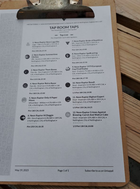 Es gibt Dinge im Leben, die man unbedingt gemacht oder gesehen haben muss. Das kann der Besuch der Stiftsbibliothek in St. Gallen sein. Oder glücklich nach 42 km durch das Ziel des Engadiner Skimarathon laufen. Oder sich in Basel im Rhein stromabwärts treiben lassen. Wie wäre es aber mit einer Reise nach Nottingham? Nicht um sich auf die Spuren von Robin Hood zu begeben, sondern um den Taproom der Neon Raptor Brewing Company zu besuchen. Das stand ziemlich weit oben auf meiner Bucket List.