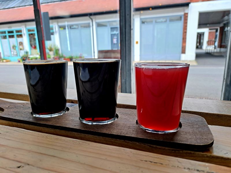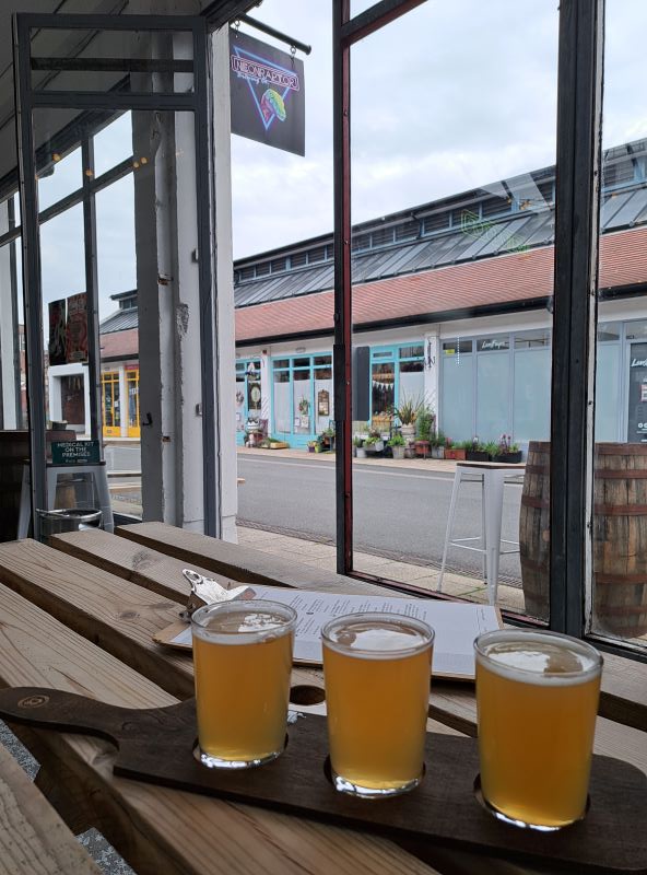 Man kann sich draussen oder drinnen an Bänke oder an grosse Holzfässer setzen. Drinnen hat es viele Leute, ist es doch mit 14 Grad recht kühl, um draussen zu bleiben. Wir bekommen aber nach ein paar Minuten einen Platz an einem Tisch. Schnell sind wir im Gespräch mit den anderen Gästen. Grossartig, es gibt Flights mit 3 x 1/3 Pint. Wir probieren zwei Flights und geniessen die hervorragenden, frischen Biere.