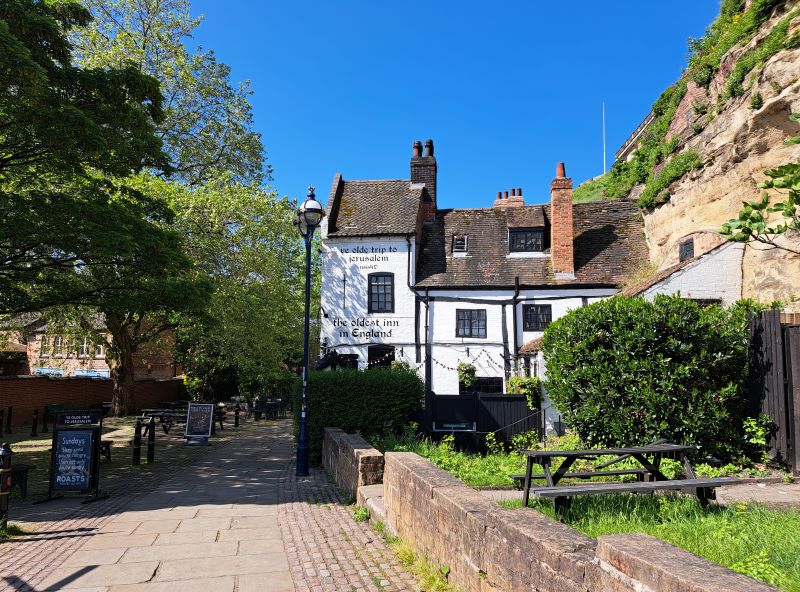 Die originellsten Sehenswürdigkeiten Nottinghams sind aber die Pubs. So zum Beispiel Ye olde trip to jerusalem, welches unterhalb des Castel teilweise in einen Felsen gehauen ist und von sich behauptet, das älteste Pub Grossbritannien zu sein. Wir sind etwas früh auf unserem Stadtrundgang und Ye olde trip to jerusalem hat noch geschlossen. Schade, der Biergarten sieht echt gemütlich aus.