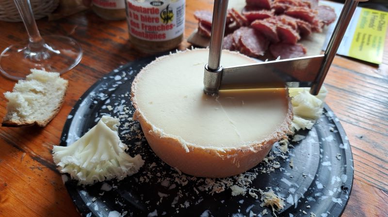 1/2 Tête de Moine oder eine Saucisse sèche oder Chat chaud Lapin-vert oder ein Fondue à la Saison et Tête de Moine. Ja, man kann auch im Sommer bei 27 Grad ein Fondue essen. Und mit dem passenden Bier ist es einfach nur Miam, miam! Wir entscheiden uns für den Tête de Moine und die Trockenwurst mit genialem Bier-Senf.