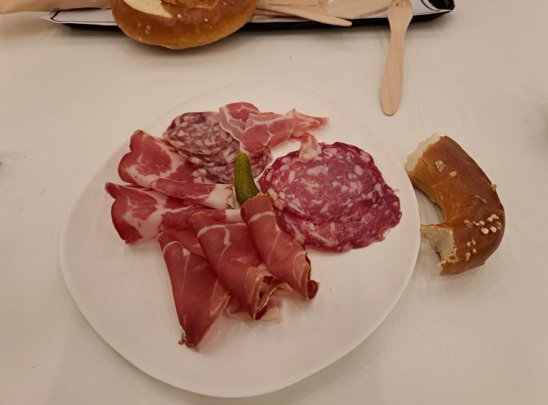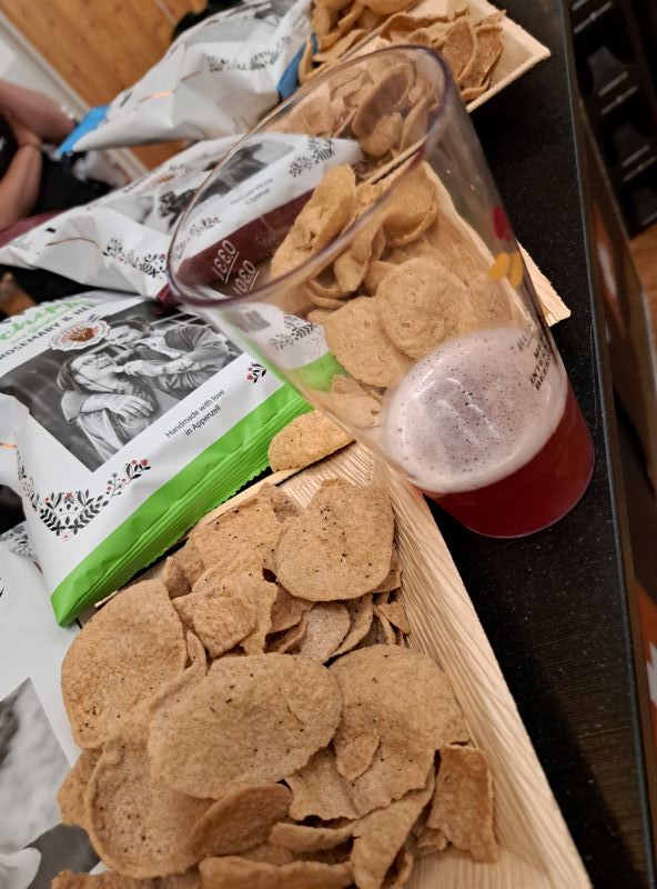 Es gibt viele feine Dinge zu essen. So zum Beispiel knusprige Tschipps von brewbee, welche aus wertvollen Nebenprodukten aus Brauereien hergestellt werden. Oder ihre pflanzenbasierte Bolognese Sauce, die wirklich lecker schmeckt. Warum nicht eine schmackige Polenta vom Restaurant Stella (Mendrisio), welche am Festival für das Leibliche Wohl sorgt? Wir entscheiden uns für die Tschipps und ein feines Tessiner Plättli. Das Glas Japanischer Sake passt wunderbar dazu – leider ist es nicht auf dem Bild zu sehen.