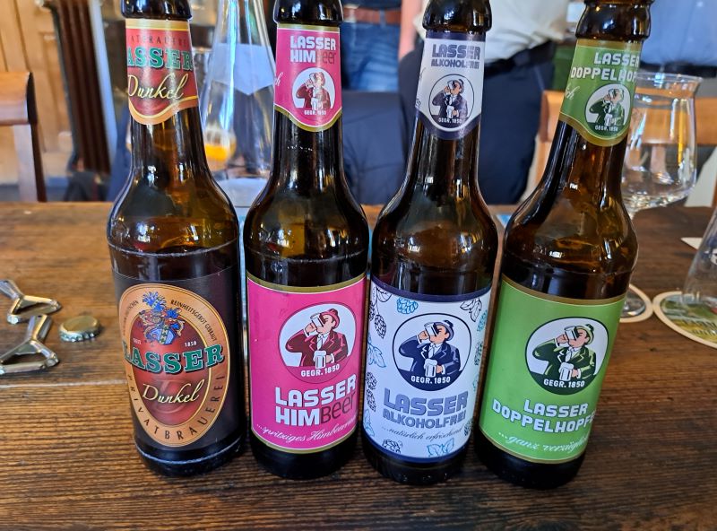 Ich starte mit dem Lasser alkoholfrei. Sofort steigen mir Noten von Tee, Minze und Gras in die Nase. Die knackige Bittere, der Hauch von Honig und die Fruchtigkeit (Pfirsich) gefällt mir sehr gut. Der schlanke Körper macht es sehr süffig und lädt zum Weitertrinken ein. Das Lasser HimBeer ist ein prickelnd, malzig-fruchtiges Bier, welches gut gekühlt und stilvoll in einem Sektglas serviert, das perfekte Apérogetränk ist. Das Lasser dunkel erinnert mich an Milchschokolade mit Nuancen von Karamell. Der Abgang ist bitter süss – ganz mein Geschmack. Eine zurückhaltende Hopfenbittere hat das Lasser Doppelhopfen, dazu ein feines Aroma nach Zitrus und Pfefferminz. Wie wär’s mit einem Stück Käse dazu?
