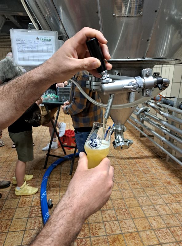 Dann kommt der Höhepunkt: das Zwickeln im Gärhaus. Wir probieren ein Basler Bier, das hier in Lörrach gebraut wird – direkt und unverfälscht aus dem Tank. Der erste Schluck ist eine Offenbarung: ultrafrisch, herrlich spritzig und voller Charakter. Ein Bier in seiner reinsten Form, so frisch, dass es fast lebendig wirkt. Ein Moment, der die Kunst des Brauens auf einzigartige Weise erlebbar macht.