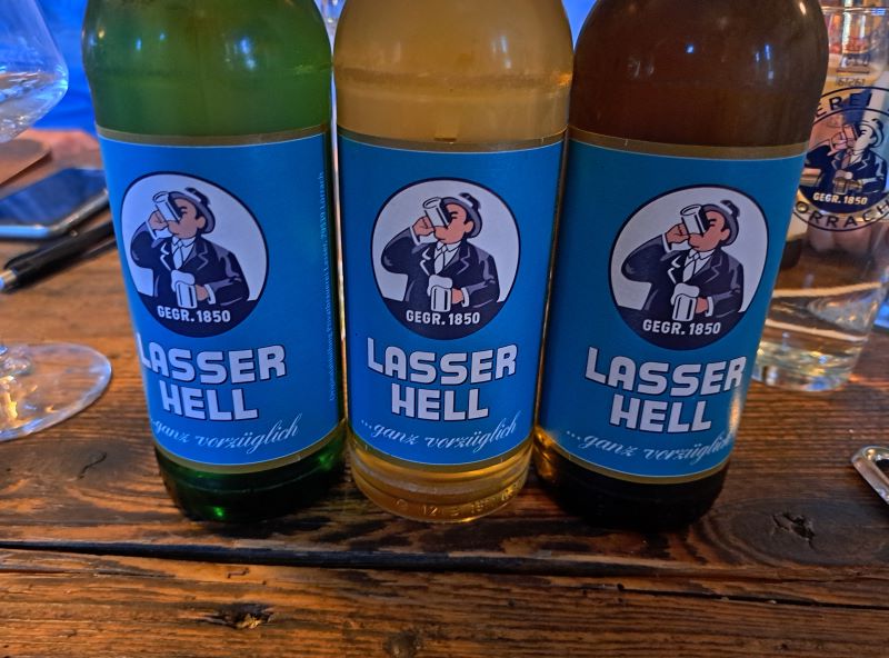 Obwohl wir eine grosse Gruppe sind, geht der Service ganz fix, so dass wir um 20.00 Uhr zum nächsten Programmpunkt gehen können: Fehlaromaverkostung ‘Lichtgeschmack’. Dieser Bierfehler entsteht, wenn Bier längere Zeit dem Licht ausgesetzt wird, insbesondere Sonnenlicht. Dies führt zu einer chemischen Reaktion, bei der die Hopfenbestandteile im Bier mit Licht reagieren und dabei unangenehme Aromen entwickeln. Diese werden oft als skunk (Stinktier) beschrieben und können den Geschmack erheblich beeinträchtigen. Wie man den Lichtgeschmack verhindern kann? Braune Flaschen bieten den besten Schutz gegen Licht und verhindert die Entwicklung des Lichtgeschmacks. Damit wir das überprüfen können hat Bernhard das Lasser Pils und das Lasser Hell in weisse, grüne und braune Flaschen abfüllen lassen. Danach standen die Biere gut einen Monat in der Sonne, so dass sich der Lichtgeschmack perfekt entwickeln konnte. Wir sind gespannt, wie sich der Geschmack der Biere in den verschiedenen Flaschen verändert hat.